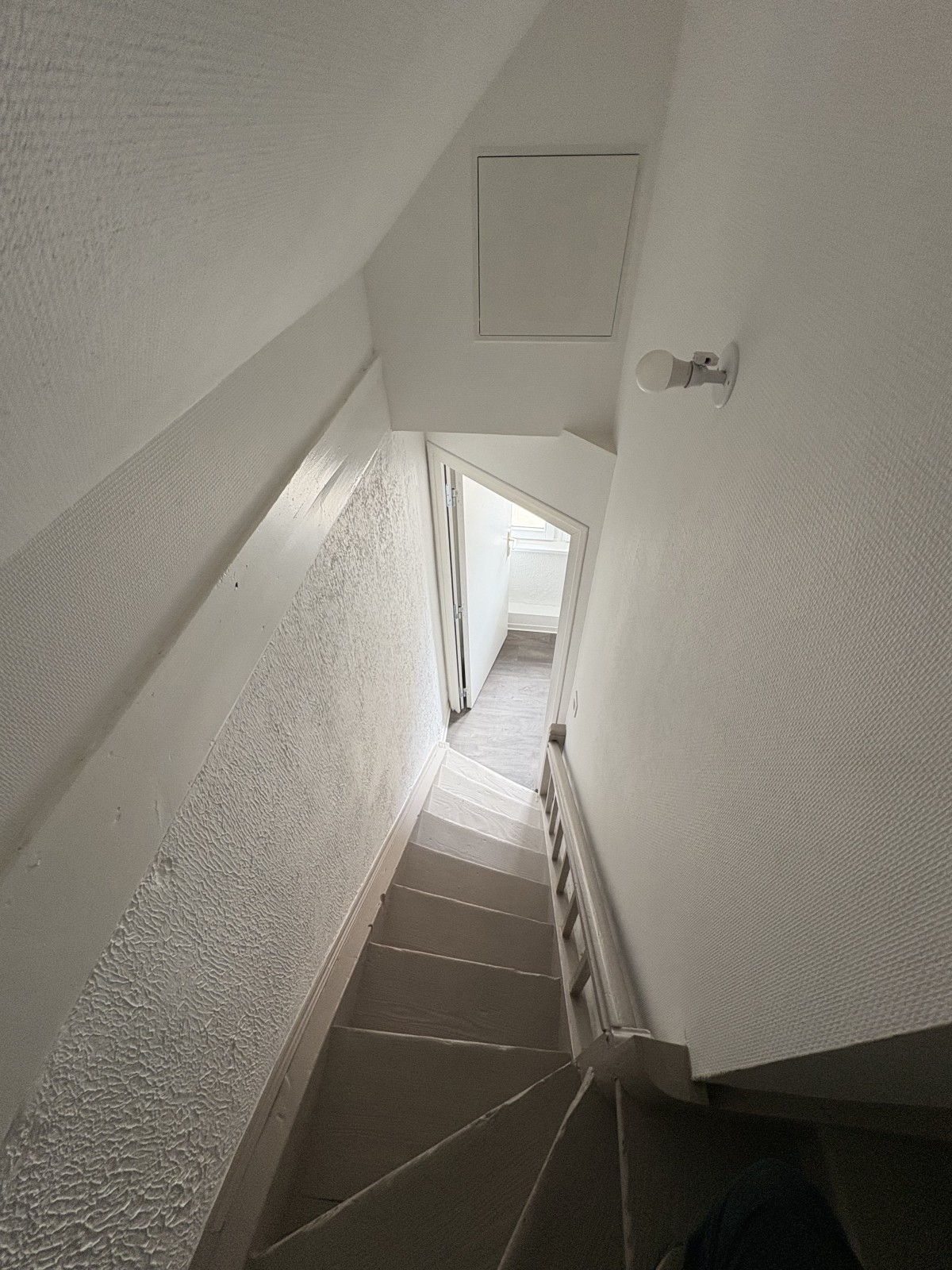 Nous avons donc faire une mise en peinture simple avec mur et plafond blanc. Les boiseries et escalier ont été fait dans une teinte plus chaude afin de s’accorder avec le revêtement de sol.