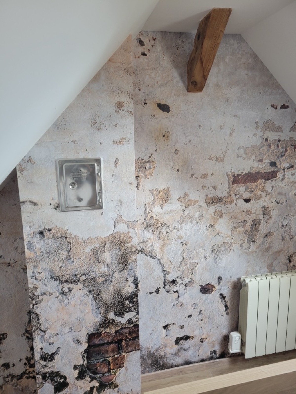 Dans cette chambre sous combles, les clients souhaitaient rafraîchir l’ensemble de la pièce. L’intervention a débuté par le remplacement de l’ancien parquet par un parquet stratifié, plus adapté à l’usage quotidien et aux contraintes de ce type de volume. En parallèle, les murs ont été lissés afin d’obtenir des surfaces parfaitement planes, prêtes à recevoir une mise en peinture soignée.