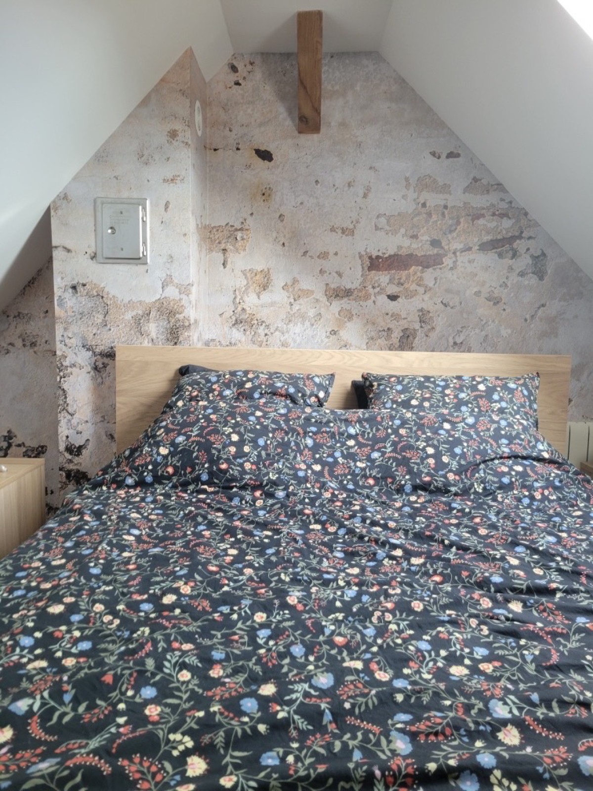 Pour compléter la rénovation, les clients ont opté pour un papier peint aspect briques usées sur le mur tête de lit. Ce revêtement mural a été commandé sur mesure afin de s’adapter parfaitement aux dimensions sous pente. La pose a été réalisée dans un second temps, dès réception du papier peint, garantissant un alignement précis et un rendu décoratif cohérent avec le nouveau sol stratifié.