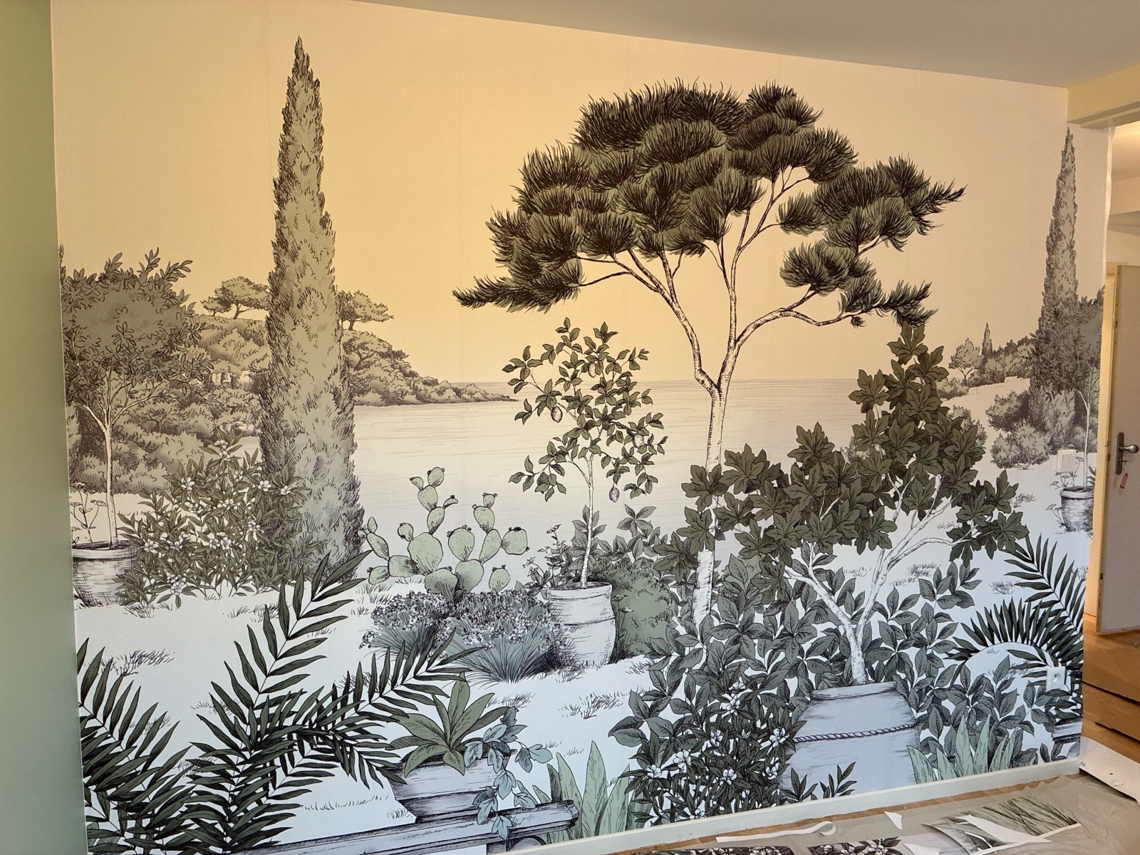 Dans certains appartements, nous avons également mis un papier peint panoramique sur un mur à la demande du client.